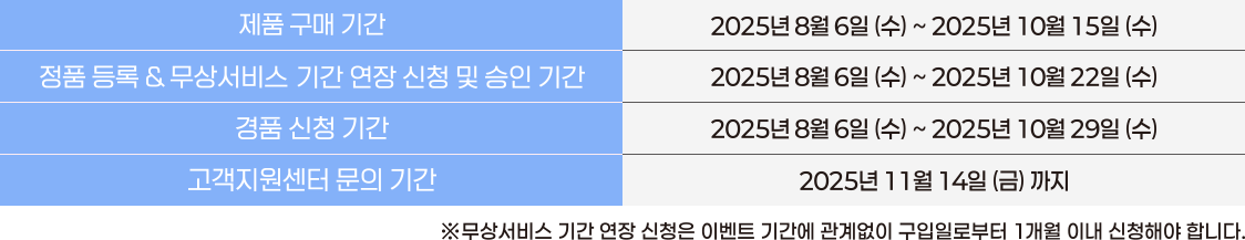 본 이벤트는 이벤트 제품 구매 기간인 2025년 8월 6일(수)부터 2025년 10월 15일(수)까지 구매한 대상 제품만 응모가 가능하며, 구매 기간 내에 제품 구매 후, 2025년 10월 22일(수)까지 정품 등록과 무상 서비스 기간 연장 신청 및 승인 완료 후, 2025년 10월 29일(수)까지 본 이벤트 페이지에서 경품 신청을 완료하여야 합니다.